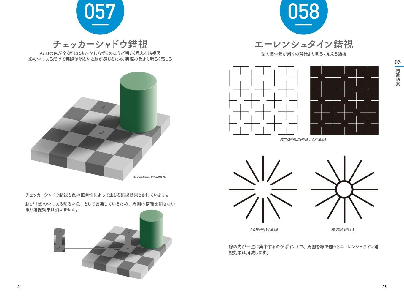Munker illusion / White illusion / Color constancy / Ambient light illusion / Checker shadow illusion, etc.