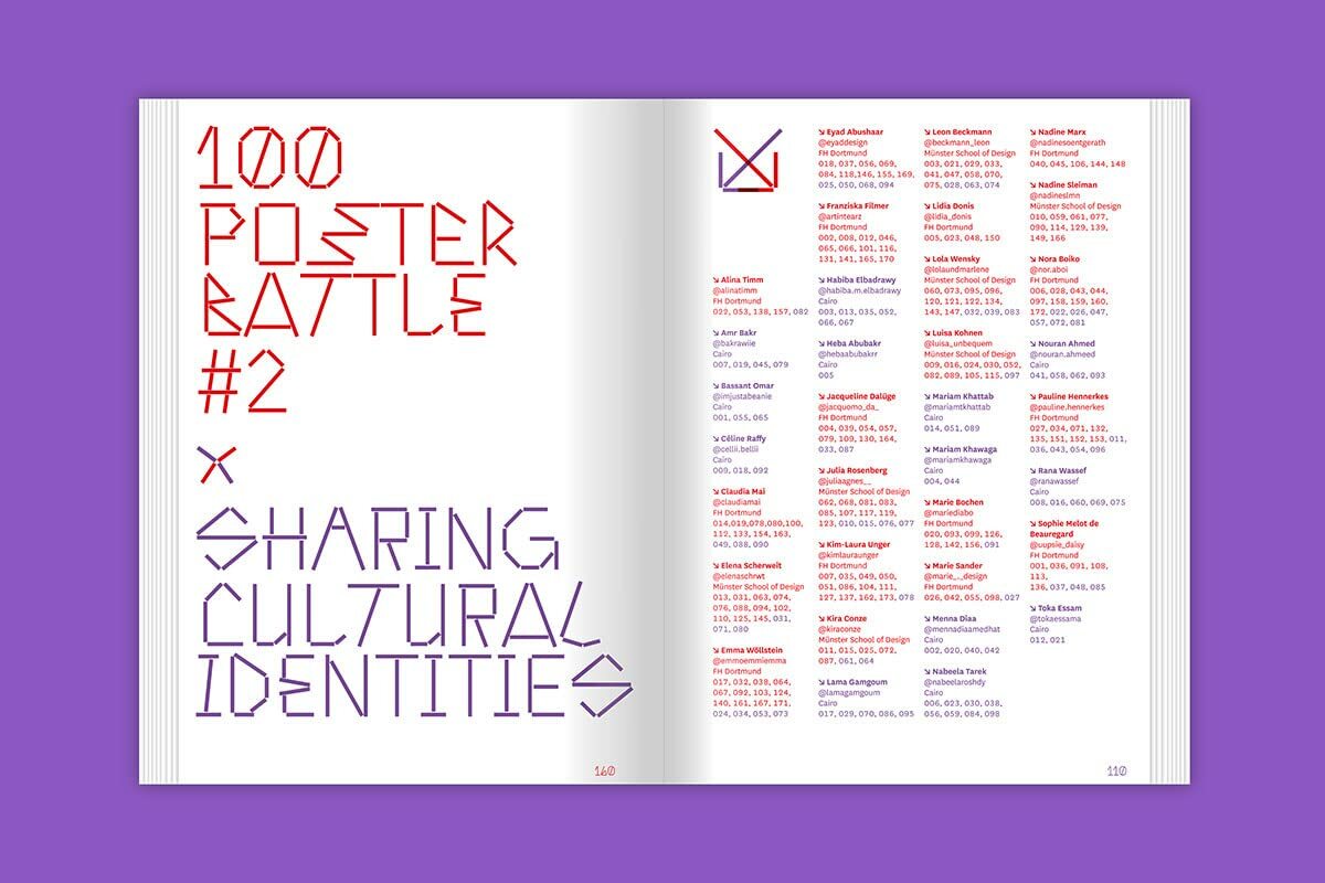 100 Poster Battle 2 — Sharing Cultural Identities is an experimental, bilingual poster design project supervised by Lars Harmsen and Markus Lange, that brings together students from different universities to design posters. In a first round, black and white basic motifs were created, consisting of typography / text, or image / illustration / photo, or background. Just like in screen printing, the various layers were to be brought together in such a way that they all use the previously created pool.