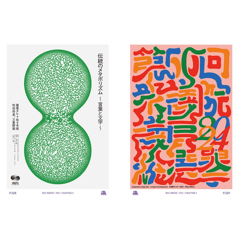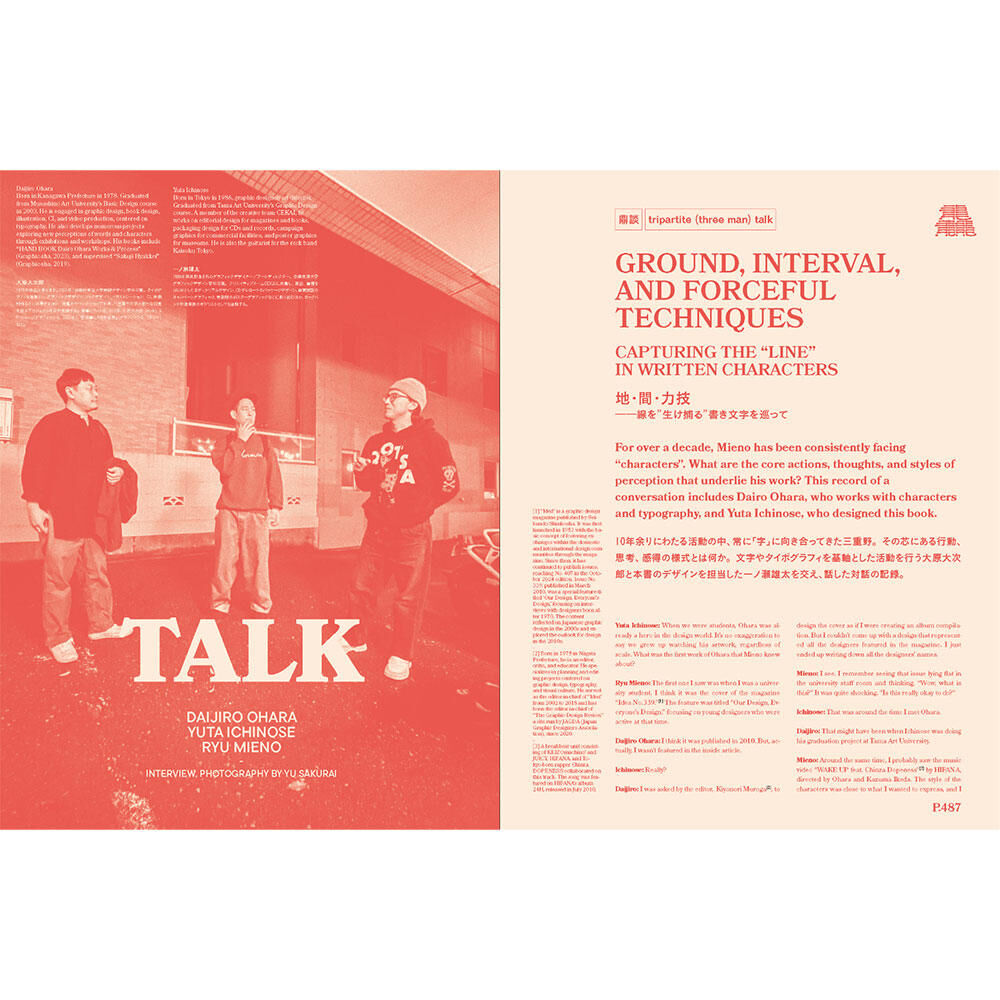The book also includes an extended roundtable discussion with fellow typographic explorer Daijiro Ohara and book designer Yuta Ichinose. Their conversation delves into Miyakeno’s creative foundations—his instincts, habits, and hesitations—providing rare insight into the quiet intensity that defines his work. Together, they reflect on how design can serve as both expression and observation, and how language can live as both form and sensation.