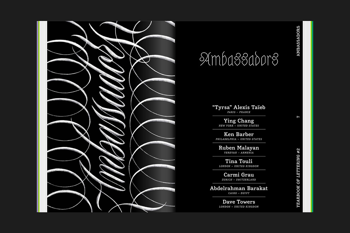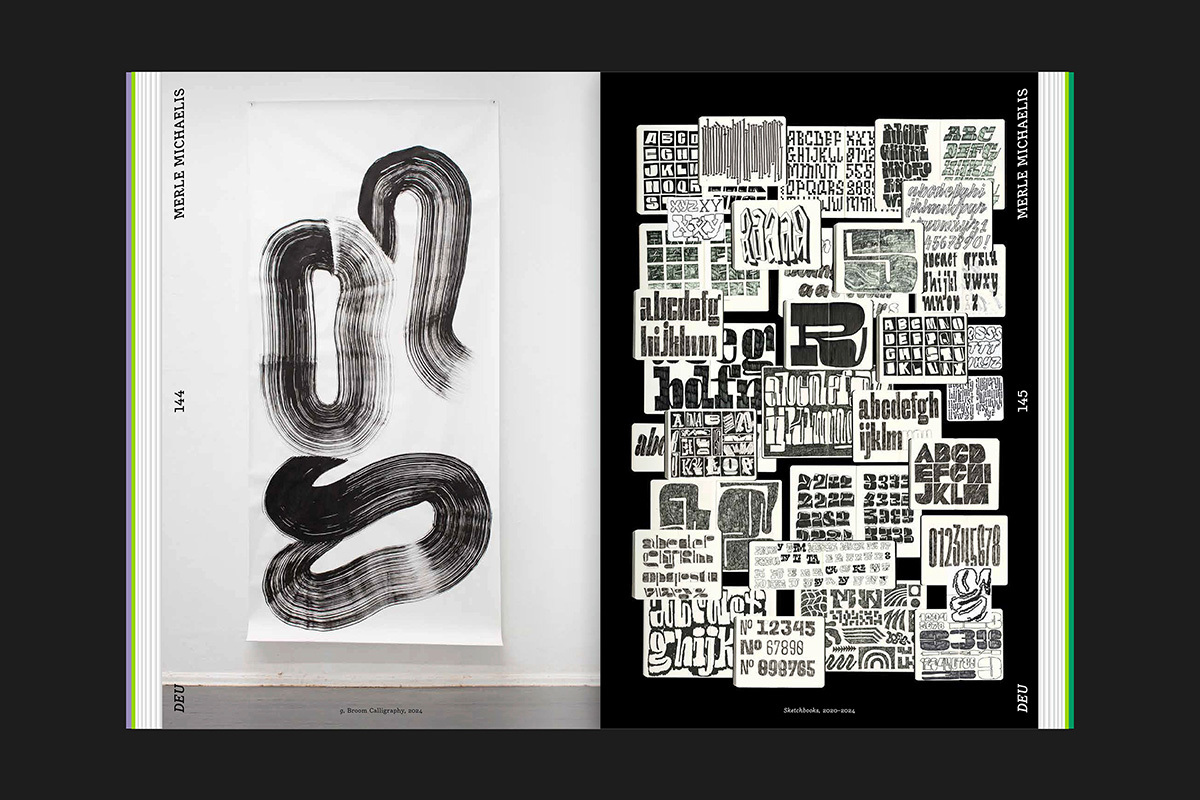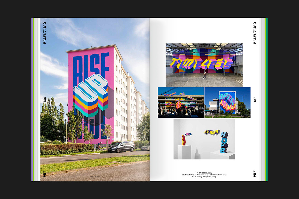 Showcasing 90 outstanding artists from 31 countries, this section provides generous space for each artist’s work, spanning calligraphy, hand lettering, graffiti, street art, and 3D lettering. Together, they reflect the full spectrum of the global lettering community.