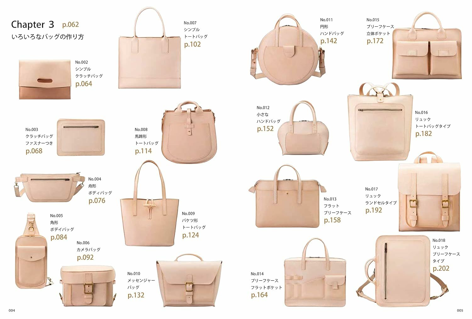 Focusing on the beauty and durability of vegetable-tanned leather (ヌメ革), this collection features 18 meticulously designed bag projects. From spacious and practical tote bags—essential for everyday use—to compact and stylish options like sacoche bags and clutches, this book covers a diverse range of styles. It also includes popular designs such as camera bags and body bags, incorporating a variety of advanced crafting techniques.