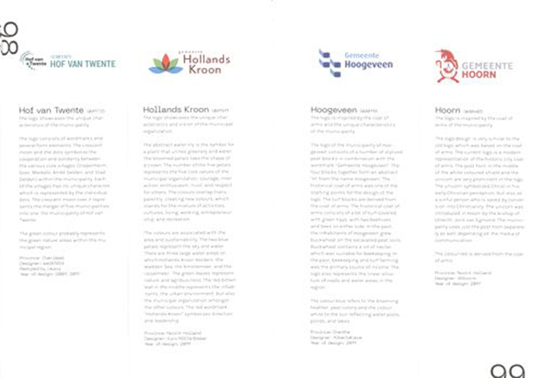 《Logo Land》一書便是這段探索歷程的成果,完整收錄並解析荷蘭 352 個市鎮的官方標誌,深入介紹每一個 logo 的誕生背景與設計意涵,解釋其中的造型結構、色彩組合與視覺語言。這些設計往往被當地居民視為理所當然,實則蘊含豐富的歷史與文化脈絡。透過本書細緻而系統性的編輯與研究,讀者得以首度全面窺見這些公共視覺資產背後的故事。