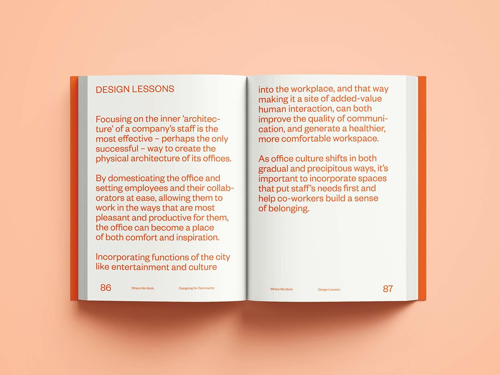 《Where We Work: Design Lessons from the Modern Office》收錄全球51個創新辦公室空間規劃設計作品,書籍分為四個章節作為介紹,以溝通上、靈活度、品牌識別和福利等面向作為主題進行深入討論,四個章節中皆有一篇介紹探討,此主題的理想和現實中如何落實,並推動符合員工與客戶體驗的工作空間。
